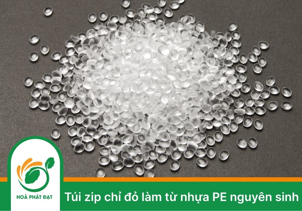 Túi zip chỉ đỏ được làm từ hạt nhựa Polyethylene (PE) nguyên sinh, không pha tạp chất. Vì chưa bị pha trộn tạp chất hay các loại nhựa khác, nên túi zip chỉ đỏ có màu trắng trong, không bị vẩn đục và không có mùi hôi như nhựa tái chế.