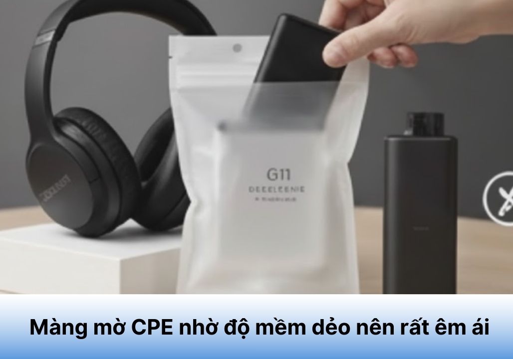 Túi nilon thường phát ra tiếng sột soạt lớn và đanh tai khi thao tác. Ngược lại, màng mờ CPE nhờ độ mềm dẻo nên rất êm ái, gần như không phát ra tiếng động khó chịu khi cầm nắm hay bóc mở. Sự tĩnh lặng này góp phần tạo nên trải nghiệm “unboxing” tinh tế và sang trọng.